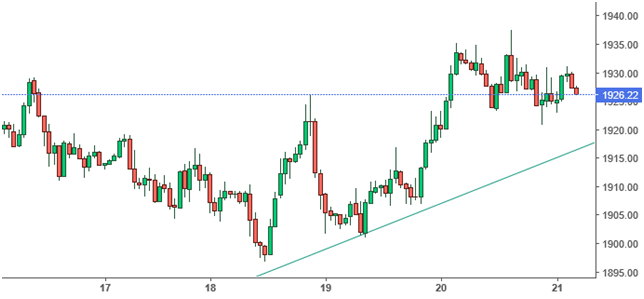 ทองคำมีสัญญาณอ่อนตัวลงมาสู่แนวรับที่ 1,920