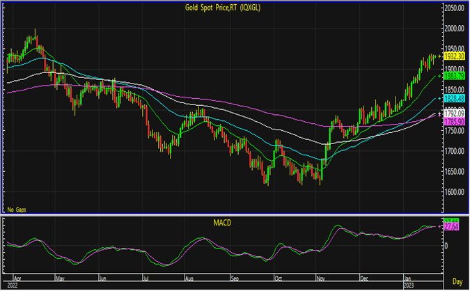 ราคาทองคำ Spot เผชิญแรงขายทำกำไรตลอดวานนี้กดให้ราคาแกว่งอ่อนตัวในช่วง 1,911-1,935 ดอลลาร์ แต่ตลาดยังคงให้ความเชื่อมั่นสูงถึง 95-100% ว่าเฟดจะปรับขึ้นอัตราดอกเบี้ยนโยบายอีกเพียงแค่ 0.25% ในการประชุมวันที่ 1 ก.พ. อีกทั้งตลาดเริ่มคาดหวังด้วยว่าประธานเฟดมีโอกาสจะส่งสัญญาณล่วงหน้าว่าจะตรึงอัตราดอกเบี้ยในช่วงกลางปี ทำให้มีแรงซื้อกลับหนุนให้ราคาทองคำที่ย่อลงใกล้ระดับ 1,900 ดอลลาร์ ดีดตัว รีบาวด์กลับขึ้นมา ทั้งนี้ กองทุน SPDR Gold Trust ไม่มีการเปลี่ยนแปลงยอดสุทธิ และยังคงถือครองทองคำ 917.06 ตัน