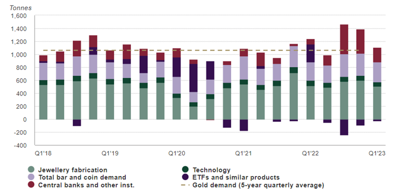 จีนมีความต้องการทองคำแท่งและเหรียญเพิ่มขึ้กว่า 34% ขณะที่อินเดียลดลงกว่า 17% นอกจากนี้ธนาคารกลางทั่วโลกเข้าสะสมทองคำอย่างต่อเนื่อง ซึ่งเข้าสะสมทองคำเพิ่มขึ้นในไตรมาสแรกของปีนี้กว่า 228.4 ตัน ซึ่งเพิ่มขึ้นกว่า 176% ที่ 82.7 ตันในไตรมาสแรกปี 2565