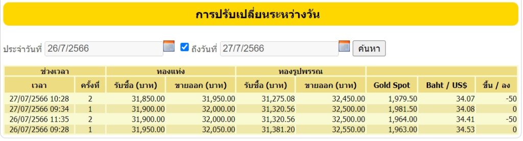 ราคาทองคำแท่งเช้าวันนี้ 27 ก.ค. เวลา 9.34 น. สมาคมค้าทองคำ ได้ประกาศราคาแรกของวัน ไม่เปลี่ยนแปลง และขยับลด -50 บาท เมื่อเวลา 10.28 น. คำนวณจากราคา gold spot ที่ 1,979.50 ดอลลาร์ และ เงินบาทที่ 34.07 บาทต่อดอลลาร์