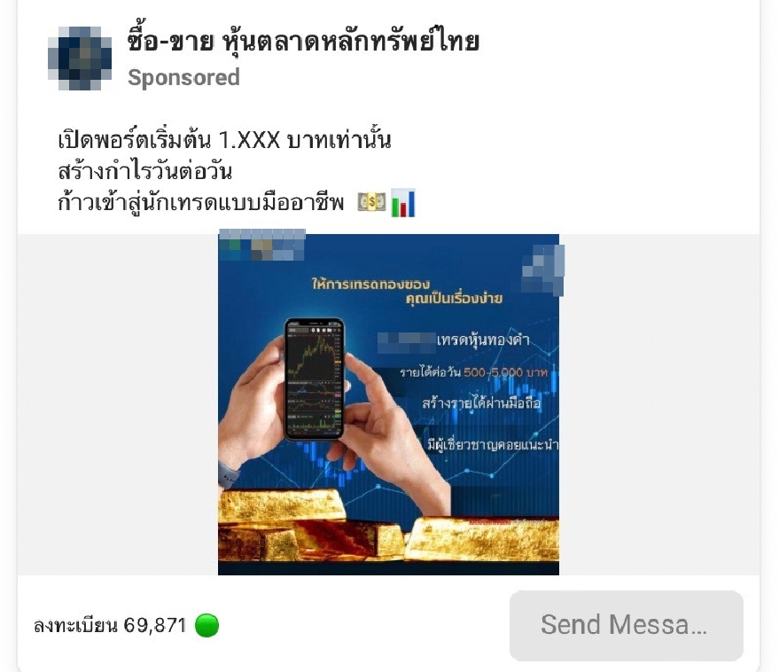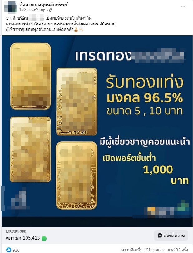 ก.ล.ต.เปิดโอกาสให้ผู้ลงทุนเทรดทองเริ่มต้น 1,999 บาท โดยจะมีผู้เชี่ยวชาญคอยดูแลและได้กำไรร้อยละ 15-30 ต่อวัน หรือลงทุนผ่านบริษัท หรือบุคคลผู้มีชื่อเสียงที่มีลักษณะข้อความเชิญชวนลงทุนมีผลกำไรสูง ให้ผลตอบแทนเป็นรายสัปดาห์