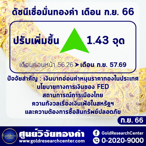 ดัชนีความเชื่อมั่นราคาทองคำประจำเดือน ก.ย.66 อยู่ที่ระดับ 57.69 เพิ่มขึ้นจากเดือน ส.ค. ที่ระดับ 56.26 จุด หรือเพิ่มขึ้น 1.43 จุด คิดเป็น 2.55%
