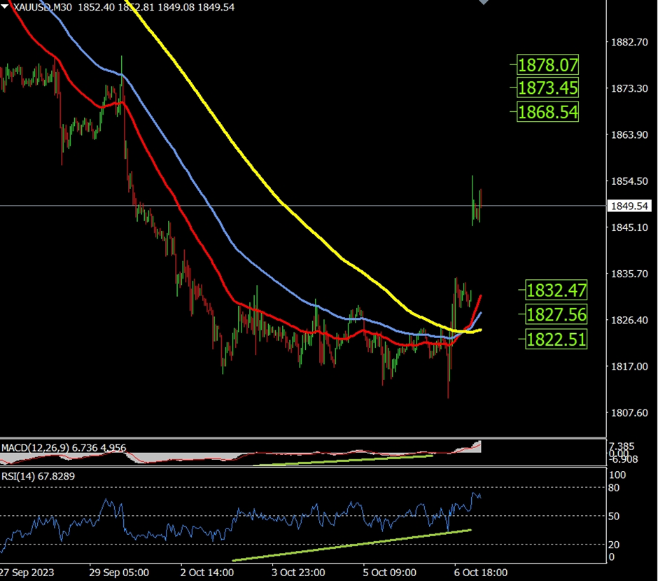 ราคาทองคำพุ่งขึ้นเกือบ 1% ยืนที่เหนือระดับ 1,840 ดอลลาร์ในช่วงเช้านี้ เนื่องจากนักลงทุนเข้าซื้อทองคำในฐานะสินทรัพย์ที่ปลอดภัย ท่ามกลางความวิตกกังวลเกี่ยวกับการสู้รบระหว่างอิสราเอลและกลุ่มฮามาสซึ่งเป็นกลุ่มติดอาวุธในปาเลสไตน์ ซึ่งการสู้รบอันดุเดือดระหว่างสองฝ่ายส่งผลให้ยอดผู้เสียชีวิตพุ่งขึ้นหลายรายแล้วในขณะนี้