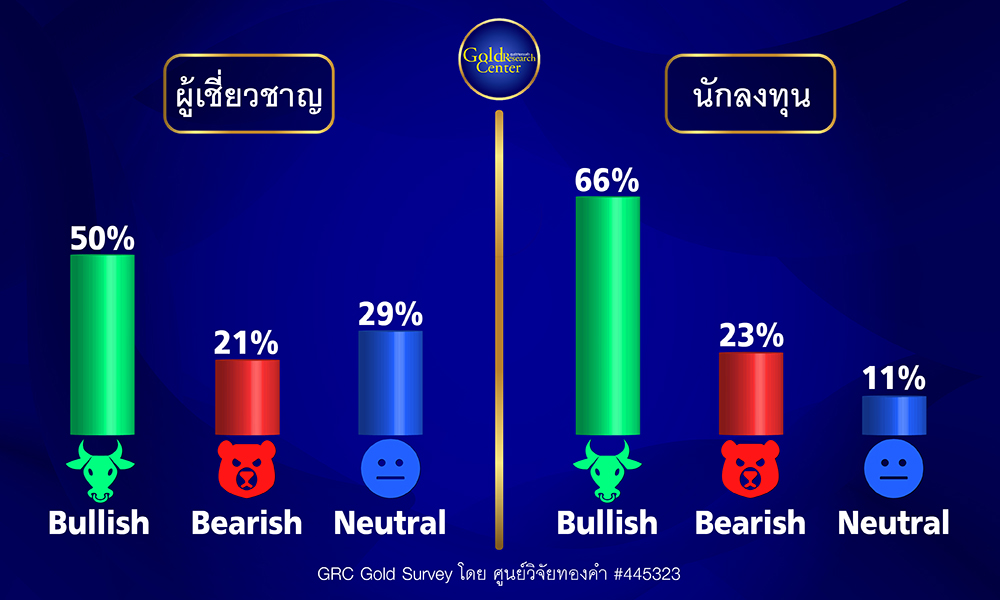 ด้านนักลงทุนทองคำ จำนวน 323 ราย ในจำนวนนี้มี 66% คาดว่าจะปรับเพิ่มขึ้น ส่วน 23% คาดว่าจะลดลง และ 11% คาดว่าจะใกล้เคียงกับสัปดาห์ที่ผ่านมา