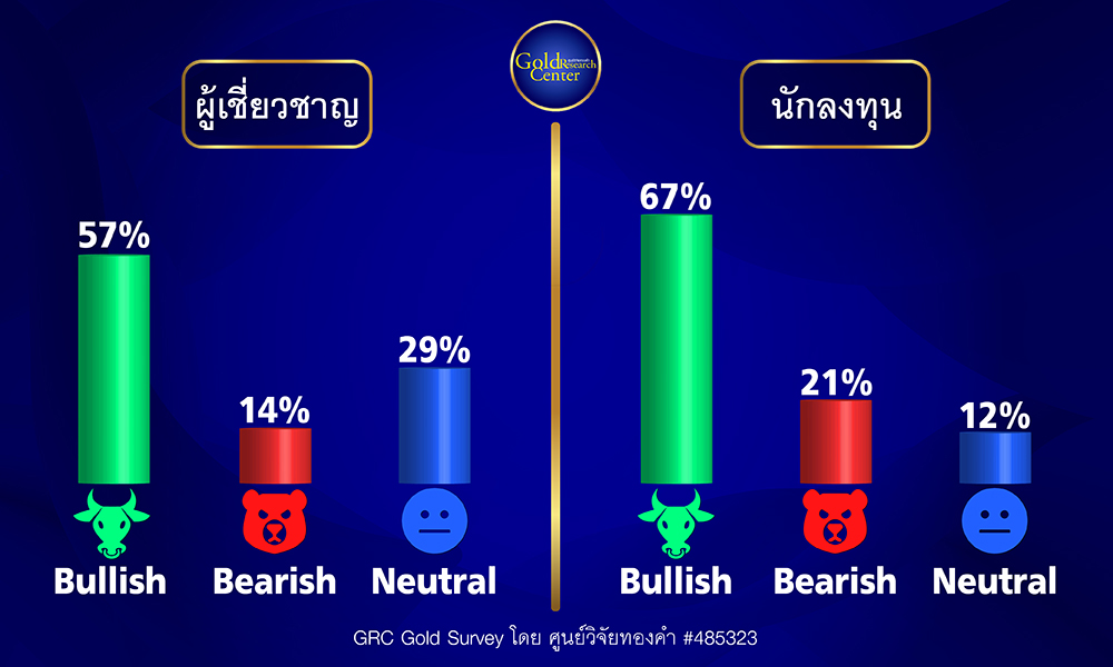 14 โบรกทองคำได้มีส่วนร่วมตอบแบบสำรวจ ในจำนวนนี้มี 57% คาดว่าราคาทองคำในสัปดาห์หน้าจะปรับเพิ่มขึ้น ส่วน 14% คาดว่าจะลดลง และ 29% คาดว่าจะใกล้เคียงกับสัปดาห์ที่ผ่านมา