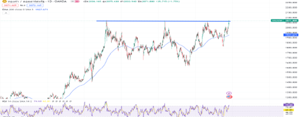 ราคาทองคำทำจุดสูงสุดใหม่ จากการคาดการณ์ว่าดอกเบี้ยได้ผ่านจุดสูงสุดไปแล้วราคาทองคำปรับตัวเพิ่มุสูงขึ้นทดสอบ $2110 เป็นจุดสูงสุดใหม่
