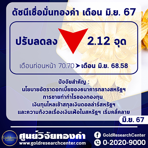 ดร.พิบูลย์ฤทธิ์ วิริยะผล ผู้อำนวยการศูนย์วิจัยทองคำ แถลงดัชนีความเชื่อมั่นราคาทองคำประจำเดือน มิถุนายน 2567 ปรับลดลงเมื่อเทียบกับเดือน พฤษภาคม 2567 ที่ผ่านมา จากระดับ 70.70 จุด มาอยู่ที่ระดับ 68.58 ลดลง 2.12 จุด หรือคิดเป็น 3%