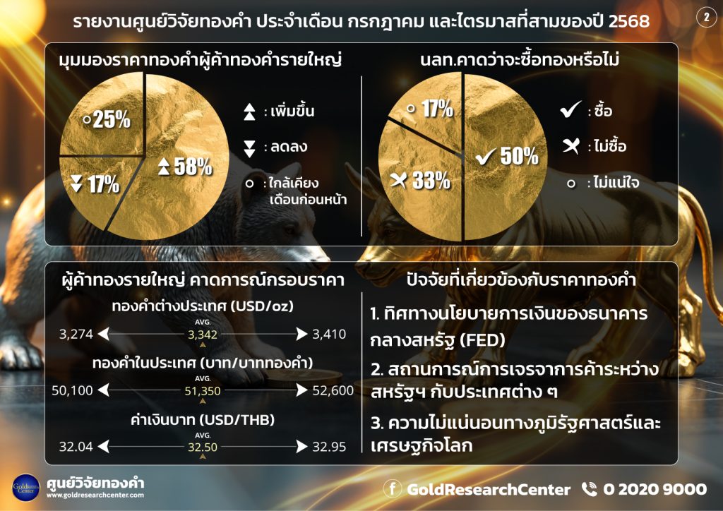สำหรับการคาดการณ์กรอบราคาทองคำในเดือน กรกฎาคม 2568 ของผู้ประกอบกิจการค้าทองคำรายใหญ่มีมุมมอง ดังนี้