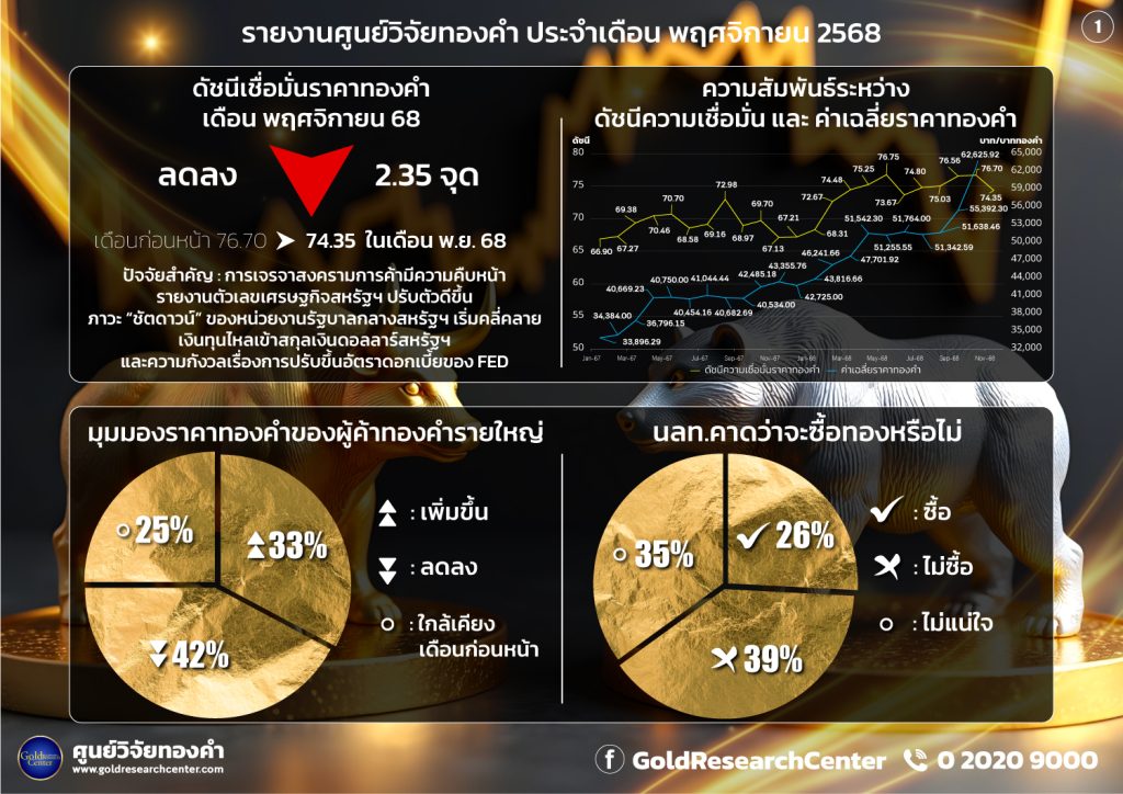 ดร.พิบูลย์ฤทธิ์ วิริยะผล ผู้อำนวยการศูนย์วิจัยทองคำ แถลงดัชนีความเชื่อมั่นราคาทองคำประจำเดือน พฤศจิกายน 2568 ปรับลดลงเมื่อเทียบกับเดือน ตุลาคม 2568 ที่ผ่านมา จากระดับ 76.70 จุด มาอยู่ที่ระดับ 74.35 ลดลง 2.35 จุด หรือคิดเป็น 3.06%