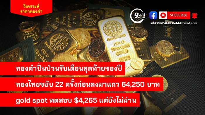 ทองคำปั่นป่วนรับเดือนสุดท้ายของปี ทองไทยขยับ 22 ครั้งก่อนลงมาแถว 64,250 บาท gold spot ทดสอบ $4,265 แต่ยังไม่ผ่าน มาดูราคาทองคำไทย เปิดเดือนธันวาคมผันผวนแรง ราคาแรกที่สมาคมค้าทองคำ ประกาศบวกมา 550 บาท จากนั้นมีการขยับราคาขึ้น-ลง 21 ครั้ง โดยรวมลดลง 300 บาท ทำให้ราคาขายออกทองคำแท่ง 96.5 ที่ สมาคมค้าทองคำ ประกาศ ณ เวลา 14.30 น. อยู่ที่ 64,250 บาท ส่วนราคารับซื้อ 64,150 บาท ขณะที่ราคาทองรูปพรรณราคาขายออก 65,050…