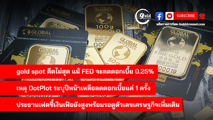 gold spot ดีดไม่สุด แม้ FED จะลดดบ.0.25% เหตุ DotPlot ระบุปีหน้าเหลือลดดบ.แค่ 1 ครั้ง ปธ.เฟด ชี้เงินเฟ้อยังสูงพร้อมรอดูตัวเลขศก.เพิ่มเติม แนะนำเข้าซื้อตามได้ทันที ไปขายทำกำไรที่แนวต้าน 4,300 ดอลลาร์ หรือราคาทองคำไทย 64,000 ดอลลาร์ส่วนราคาทองคำไทย ราคาแรกของวันที่ สมาคมค้าทองคำ ประกาศเพิ่มขึ้น 300 บาท จากนั้นอีก 1.30 ชั่วโมงจะปรับราคาลง อีก 4 ครั้ง โดยรวมลดลงอีก 200 บาท ทำให้ราคาขายออกทองคำแท่ง ณ เวลา 10.30 น. อยู่ที่…