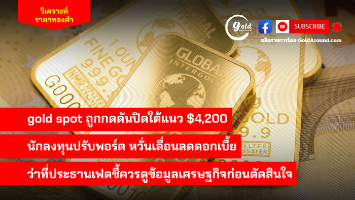 gold spot ถูกกดดันปิดใต้แนว $4,200 นลท.ปรับพอร์ต หวั่น FED เลื่อนลด ดบ. ว่าที่ ปธ.เฟดชี้ควรดูข้อมูล ศก.ก่อนตัดสินใจ มาดูราคาทองคำไทยครึ่งวันแรกยังเคลื้อนไหวแดนลบ โดยราคาแรกของวันที่ สมาคมค้าทองคำ ประกาศลดลงไป 150 บาท จากนั้นปรับราคาขึ้น-ลง อีก 4 ครั้ง ลดลงไปอีก 100 บาท ทำให้ราคาขายออกทองคำแท่ง ณ เวลา 12.45 น. อยู่ที่ 63,200 บาท ส่วนราคารับซื้อ 63,100 บาท ขณะที่ราคาทองรูปพรรณราคาขายออก 64,000 บาท ส่วนราคารับซื้อ…