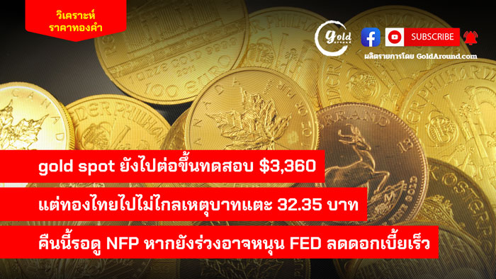 gold spot ยังไปต่อขึ้นทดสอบ $3,360 แต่ทองไทยไปไม่ไกลเหตุบาทแตะ 32.35 บาท คืนนี้รอดู NFP หากยังร่วงอาจหนุน FED ลดดบ.เร็ว มาดูภาพรวมการเคลื่อนไหวของราคาทองคำไทย สมาคมค้าทองคำ ประกาศราคาขายออกทองคำแท่ง 96.5 ณ 10.35 น. อยู่ที่ 51,250 บาท ส่วนราคารับซื้อ 51,150 บาท ขณะที่ราคาทองรูปพรรณราคาขายออก 52,050 บาท ส่วนราคารับซื้อ 50,134.12บาท คำนวณจากเงินบาทที่ 32.35 บาทต่อดอลลาร์ ด้าน ทาง ShiningGold bullion มองว่า ราคาทองคำไทยอยู่ในช่วงทดสอบการกลับตัว โดยปกติสัญญาณการกลับตัวจะมาช้ากว่าราคาที่ดีดตัวขึ้นไปแล้วเสมอ…