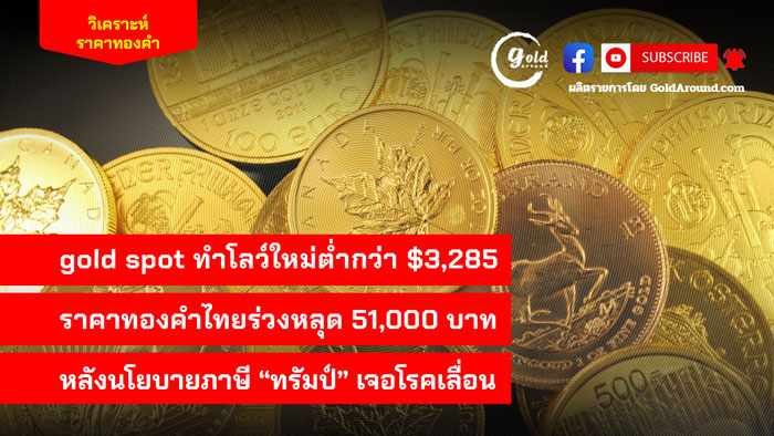 gold spot ทำโลว์ใหม่ต่ำกว่า $3,285 ราคาทองคำไทยร่วงหลุด 51,000 บาท หลังนโยบายภาษี “ทรัมป์” เจอโรคเลื่อน มาดูภาพรวมการเคลื่อนไหวของราคาทองคำไทย เช้านี้ ( 9 ก.ค.) สมาคมค้าทองคำ ประกาศราคาแรกของวันลดลง 200 บาท ก่อนอีก 45 นาที ถัดมาจะปรับลดลงอีก 50 บาท ทำให้ราคาขายออกทองคำแท่ง 96.5 ณ 10.35 น. อยู่ที่ 50,950 บาท ส่วนราคารับซื้อ 50,850 บาท ขณะที่ราคาทองรูปพรรณราคาขายออก 51,750 บาท ส่วนราคารับซื้อ…
