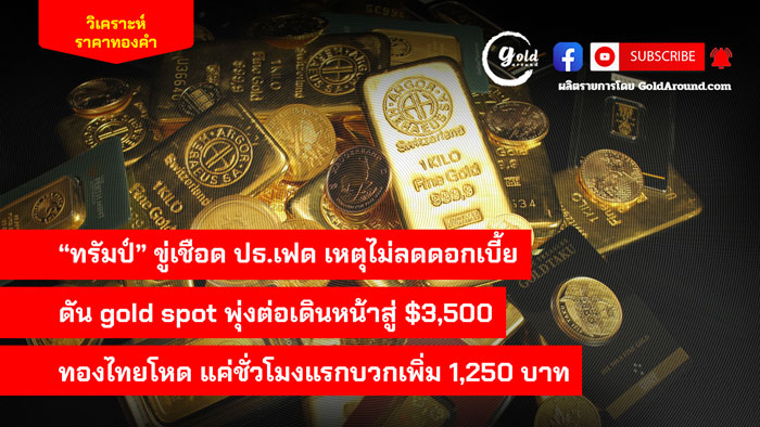“ทรัมป์” ขู่เชือด ปธ.เฟด เหตุไม่ลดดบ. ดัน gold spot พุ่งต่อเดินหน้าสู่ $3,500 ทองไทยโหด แค่ชม.แรก บวกเพิ่ม 1,250 บาท ดำเนินรายการโดย อนุสรณ์ แก้วประจันทร์ บรรณาธิการข่าว goldaround.9na.me/ มาดูภาพรวมการเคลื่อนไหวของราคาทองคำไทยเช้านี้ถือว่าขัยบขึ้นรุนแรงทำสถิติ โดยราคาแรกสมาคมค้าทองคำ ประกาศราคาแรกของวัน ( 22 เม.ย.) เพิ่มขึ้น 950 บาท ก่อนที่ในชั่วโมงแรกของการซื้อขาย จะปรับราคาขึ้น-ลงรวม 7 ครั้ง เป็นการปรับขึ้น 100 บาท 2 ครั้ง ปรับขึ้น 50 บาทอีก 3…