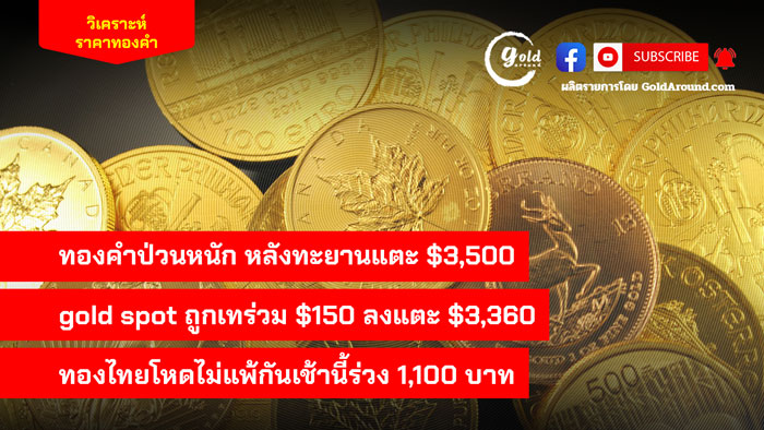 ทองคำป่วนหนัก หลังทะยานแตะ $3,500 gold spot ถูกเทร่วม $150 ลงแตะ $3,360 ทองไทยโหดไม่แพ้กันเช้านี้ร่วง 1,100 บาท ดำเนินรายการโดย อนุสรณ์ แก้วประจันทร์ บรรณาธิการข่าว goldaround.9na.me/ มาดูภาพรวมการเคลื่อนไหวของราคาทองคำไทยวานนี้ ทำสถิติการปรับเปลี่ยนระหว่างวันมากถึง 35 ครั้ง โดยเป็นการปรับขึ้น 21 ครั้ง และปรับลง 14 ครั้ง รวมบวกขึ้นมา 1,250 บาท พร้อมทำสถิติราคาขายออกทองคำแท่งสูงสุดตลอดกาล (ATH) ที่ 54,800 บาท ขณะที่ราคาทองคำรูปพรรณอยู่ที่ 55,600 บาท ส่วนเช้านี้ราคาเริ่มเคลื่อนไหวผันผวนเช่นกัน แต่เป็นการผันผวนในทางลบ โดย…