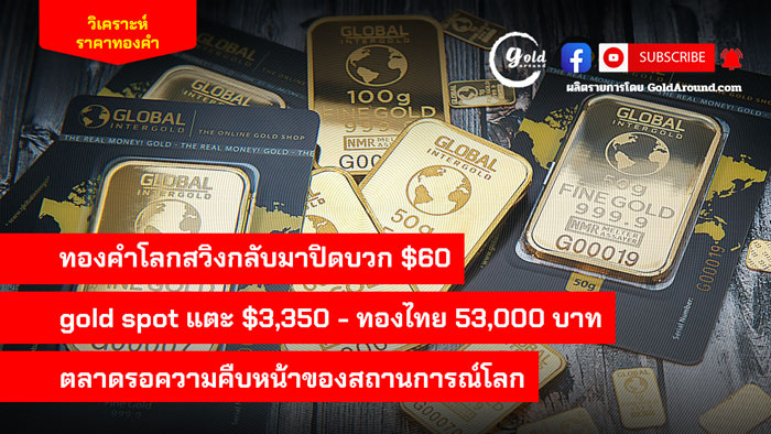 ทองคำโลกสวิงกลับมาปิดบวก $60 gold spot แตะ $3,350- ทองไทย 53,000 บาท ตลาดรอความคืบหน้าของสถานการณ์โลก ดำเนินรายการโดย อนุสรณ์ แก้วประจันทร์ บรรณาธิการข่าว goldaround.9na.me/ ภาพรวมการเคลื่อนไหวของราคาทองคำไทย เช้านี้เริ่มชะลอความผันผวน โดยสมาคมค้าทองคำประกาศราคาแรกของวัน ( 25 เม.ย.) ปรับเพิ่มขึ้น 200 บาท ก่อนอีกชั่วโมงถัดมาจะประกาศเพิ่มขึ้น 50 บาท ทำให้ราคาขายออกทองคำแท่ง 96.5 ณ เวลา 10.30 น. อยู่ที่ 53,050 บาท ส่วนราคารับซื้อ 52,950 บาท ขณะที่ราคาทองรูปพรรณราคาขายออก 53,850…