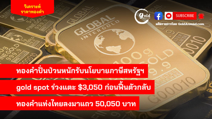 ทองคำปั่นป่วนหนักรับนโยบายภาษีสหรัฐ gold spot ร่วงแตะ $3,050 ก่อนฟื้นตัวกลับ ทองคำแท่งไทยลงมาแถว 50,050 บาท ดำเนินรายการ โดย อนุสรณ์ แก้วประจันทร์ บรรณาธิการข่าว goldaround.9na.me/ มาดูราคาทองคำไทยวานนี้ เคลื่อนไหวผันผวนมาก โดยได้ทำ ATH ที่ 51,250 บาท ก่อน สมาคมค้าทองคำ ประกาศปรับราคาขึ้น-ลง รวม 29 ครั้ง โดยรวมปิดตลาดลดลงไป 600 บาท และในวันนี้(4 เม.ย.)ก็ส่อเค้าผันผวนหนักเช่นกัน โดยสมาคมค้าทองคำประกาศราคาแรกของวันลดลง 400 บาท ก่อนอีกชั่วโมงถัดมาจะปรับขึ้นและลง 6 ทำให้ราคาขายออกทองคำแท่ง 96.5…