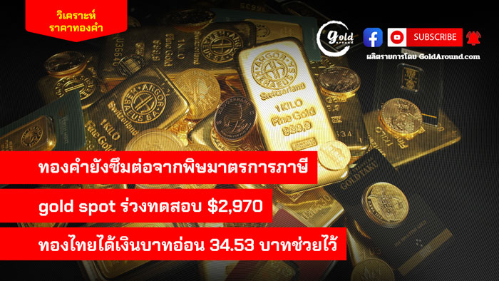 ทองคำยังซึมต่อจากพิษมาตรการภาษี gold spot ร่วงทดสอบ $2,970 ทองไทยได้เงินบาทอ่อน 34.53 บาทช่วยไว้ ดำเนินรายการ โดย อนุสรณ์ แก้วประจันทร์ บรรณาธิการข่าว goldaround.9na.me/ ราคาทองคำไทยสัปดาห์ที่ผ่านมาเคลื่อนไหวผันผวนมาก หลังได้ทำ ATH ที่ 51,250 บาท ก่อนจะถูเทขายจนมาปิดสัปดาห์ที่ 49,700 บาท ก่อนที่ช่วงเช้าวันนี้จะยังทรงตัว หลังจากที่ สมาคมค้าทองคำ ประกาศราคาแรกของวันเพิ่มขึ้น 150 บาท แต่หลังจากนั้นปรับลดลงครั้งละ 50 บาท 3 ครั้ง ทำให้ราคาขายออกทองคำแท่ง 96.5 ณ เวลา 10.20 น.…